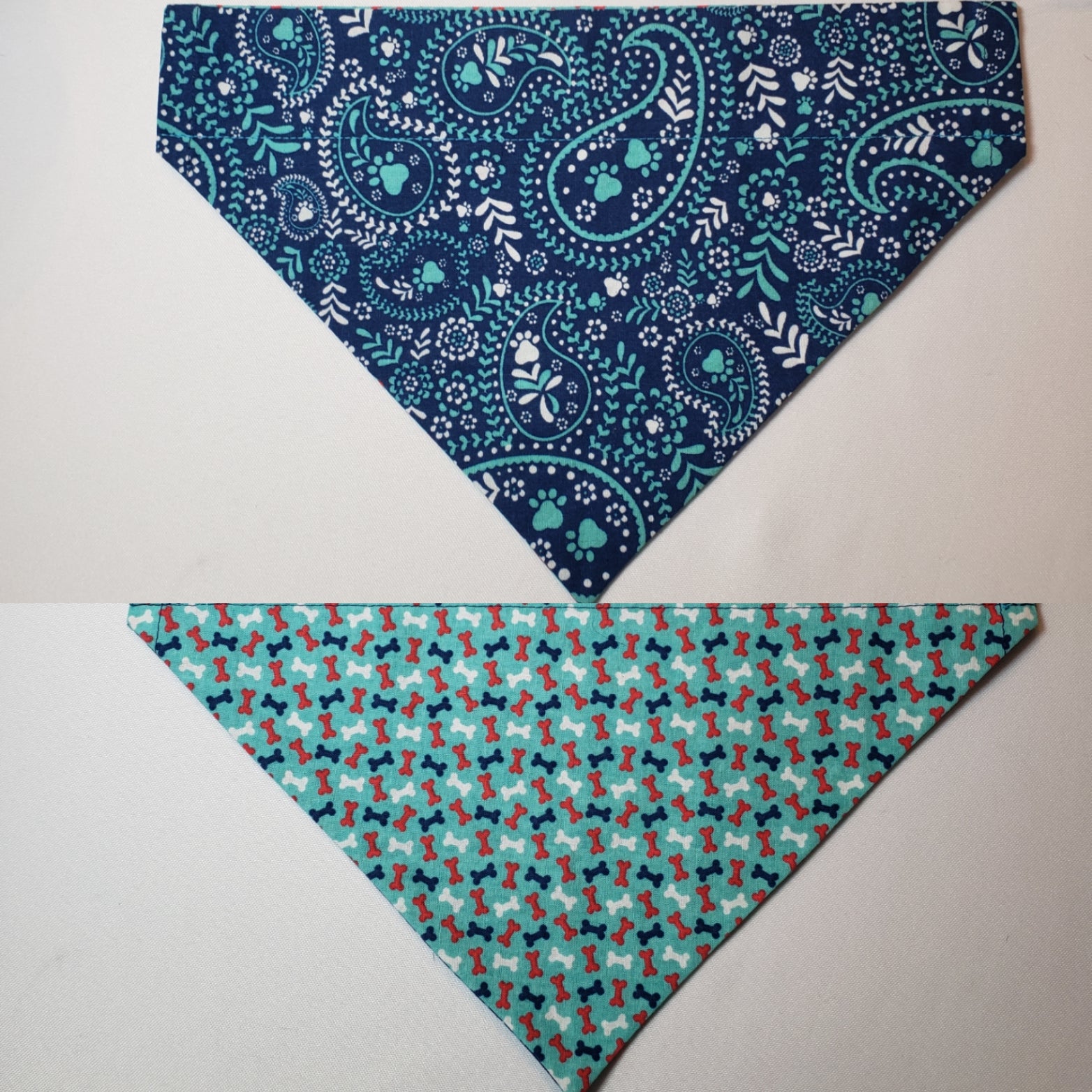 This bandana is reversible and slips over your dog, cat, or other pet's collar.