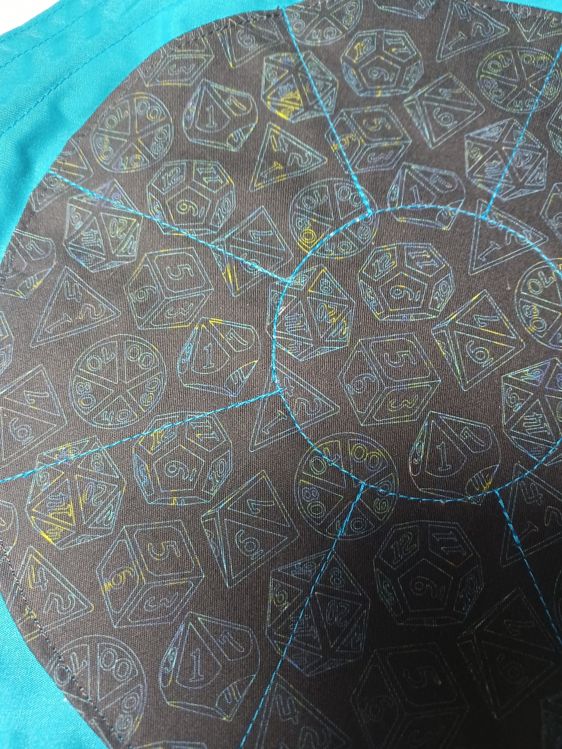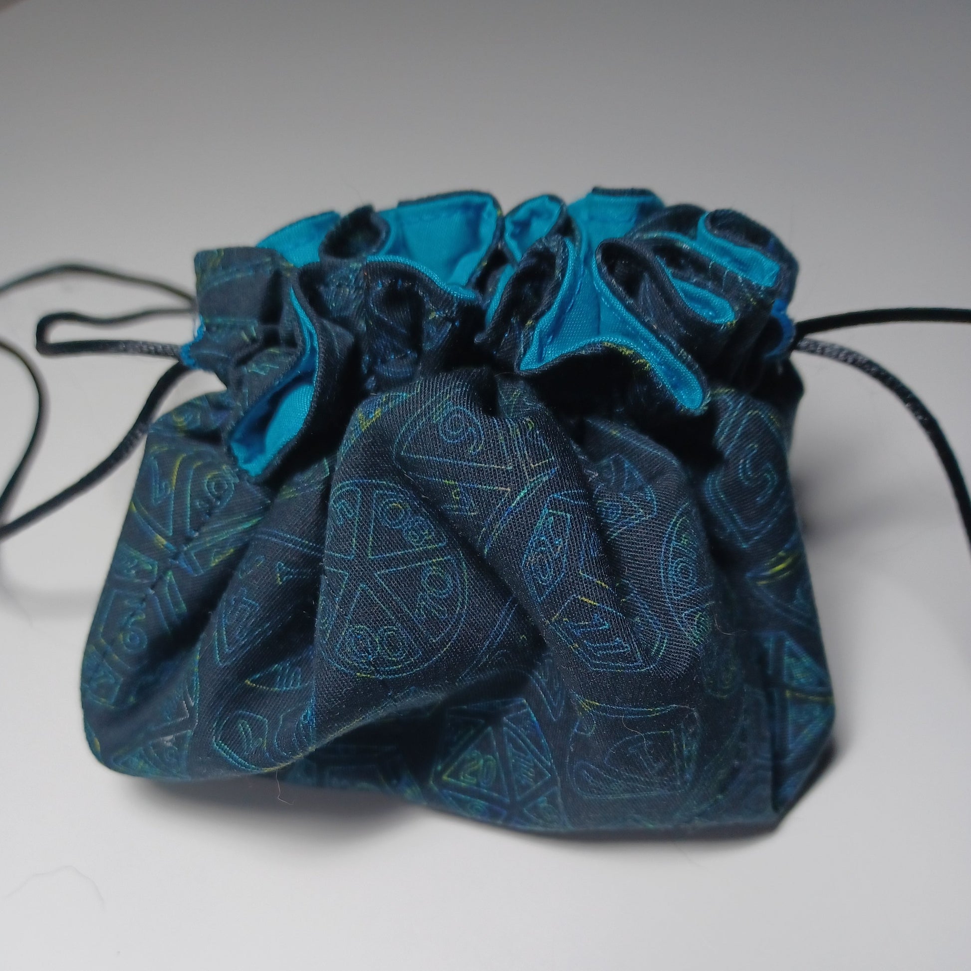 This bag can be used as a dice bag or bundle bag (for crystals and tumbled stones), and for runes, jewelry, LEGO minifigs, Shopkins, and whatever else your imagination comes up with. It has eight pockets inside, plus a large center pocket when tied up. The edges can stay raised to make a small tray for rolling dice or runes. A double drawstring is used to open and close the bag, as well as adjust into a tray.