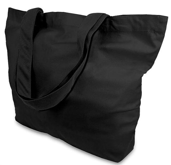 Tote Bag (black or natural): 15" tall x 18-1/2" wide x 4.8" deep; Handles: 100% cotton canvas fabric, 10-1/2" handle drop